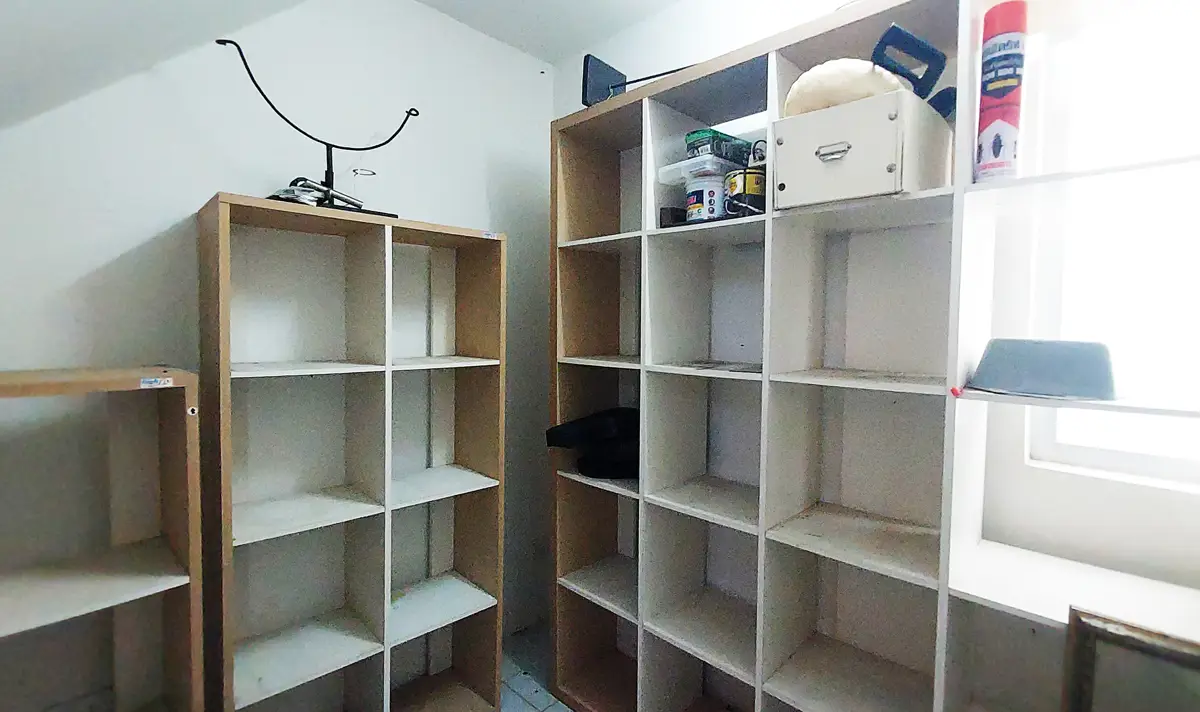 The 3-level villa has a living area of 364 square meters. On the first floor there is a large family room, a kitchen and a toilet, as well as two storage rooms and a terrace, partly under cover. One of the storage rooms is under the stairs to the upper floor. While a larger storage room is in a separate one-room building, which today also has a washing machine and an extra bed. From the terrace you have direct access to the pool area and from there to the beach.