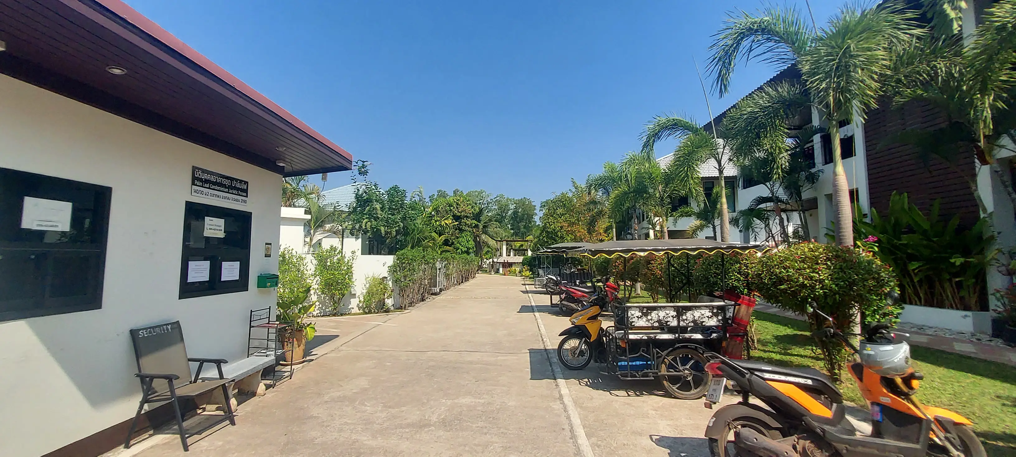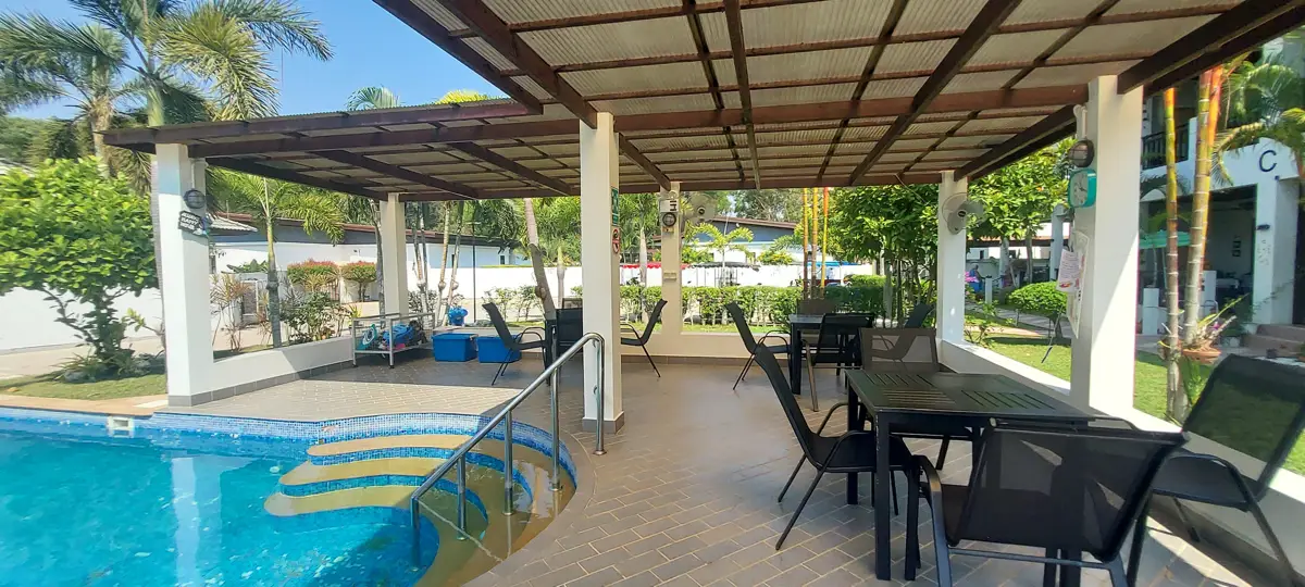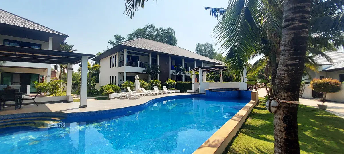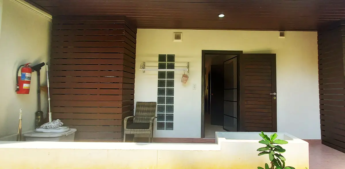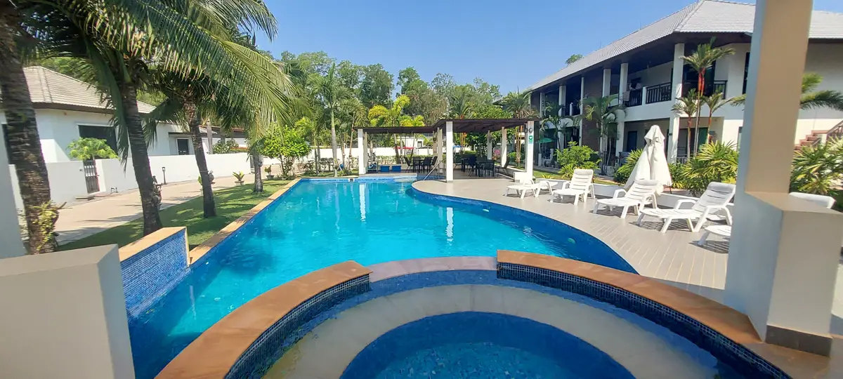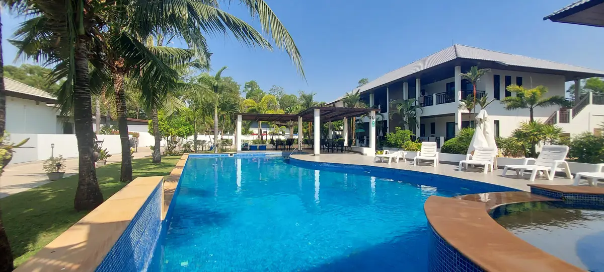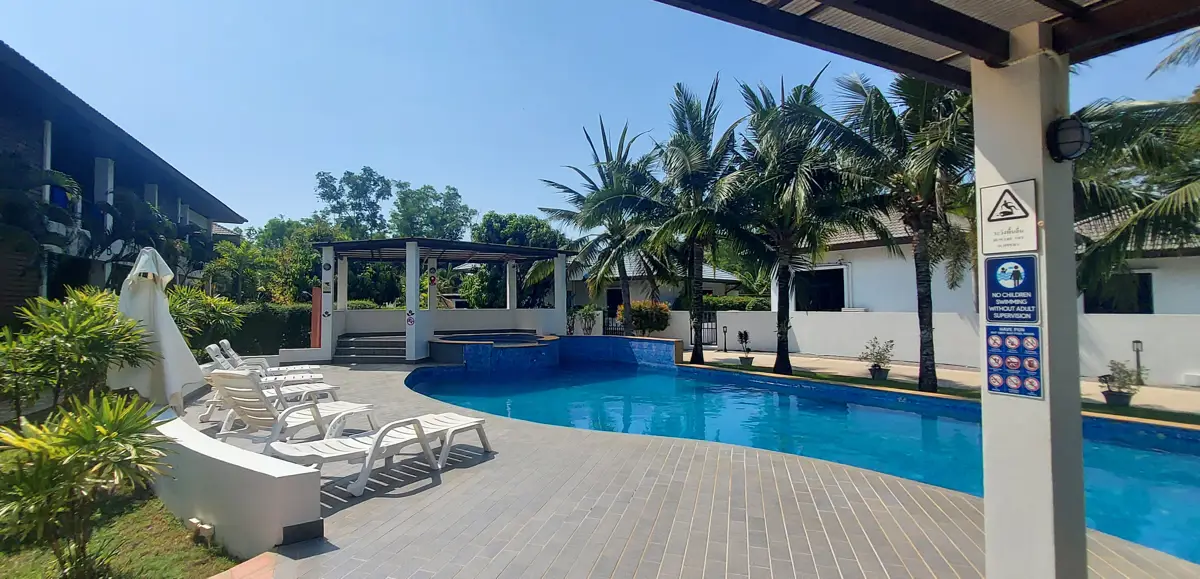 Palm Leaf Condominium consists of 3 2-storey houses with 8 condos in each. So a total of 24 condos with living areas of 47 sq m (1 bedroom) and 70 sq m (2 bedrooms). There are also 6 detached villas and in the center a large lovely pool area with jacuzzi and barbecue area. The pool is a freshwater pool, but will soon become a saltwater pool.