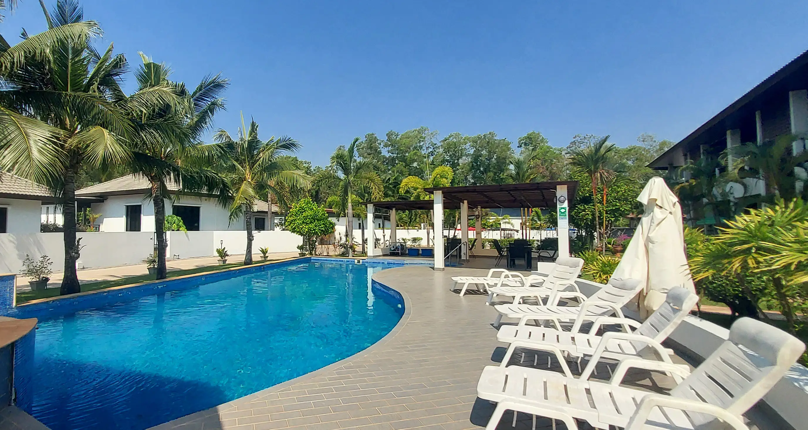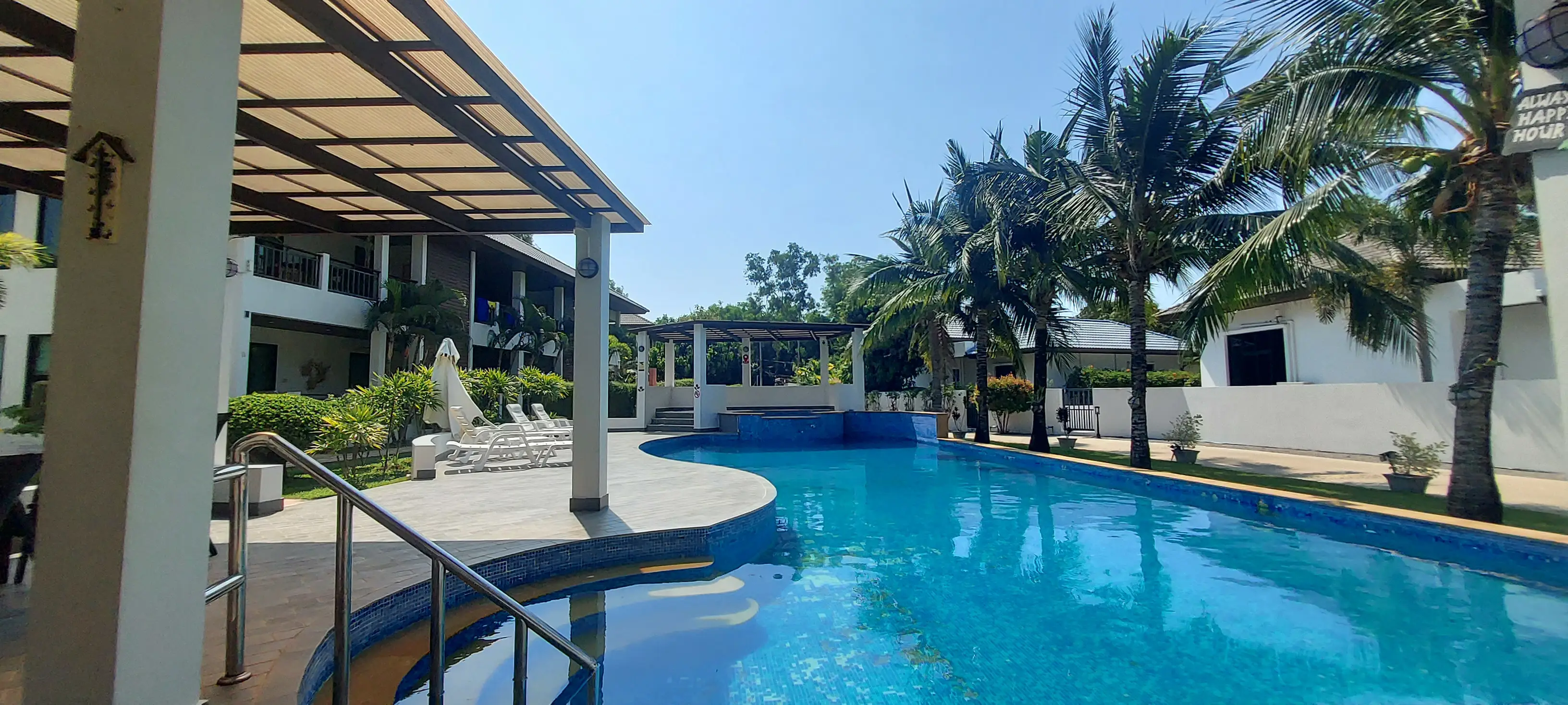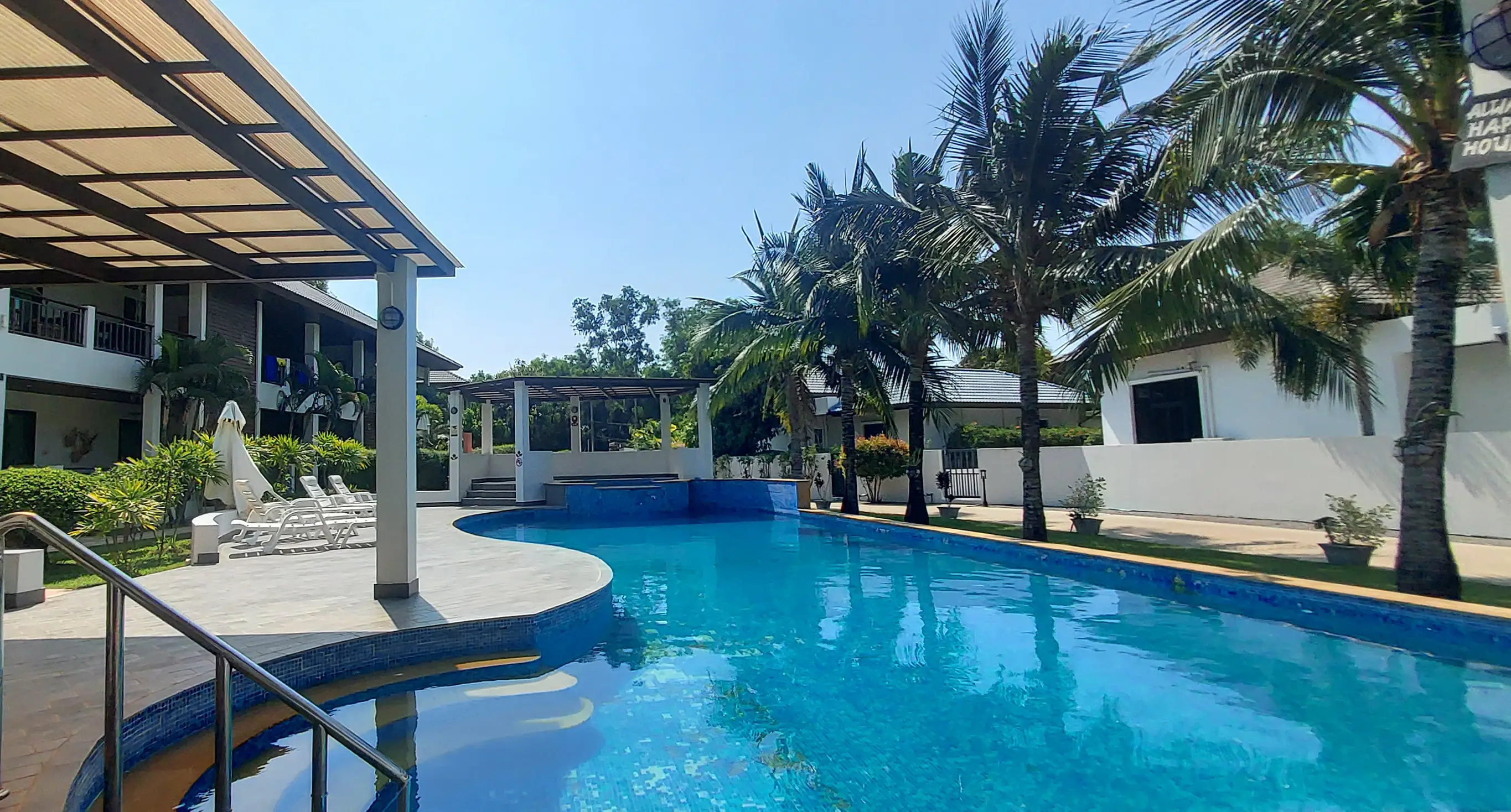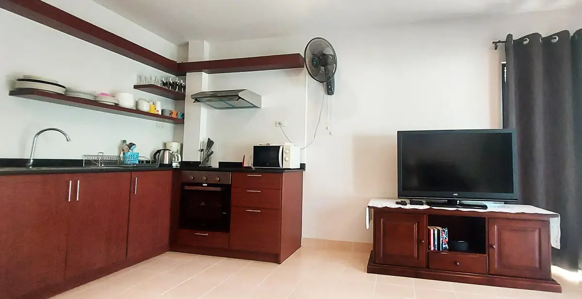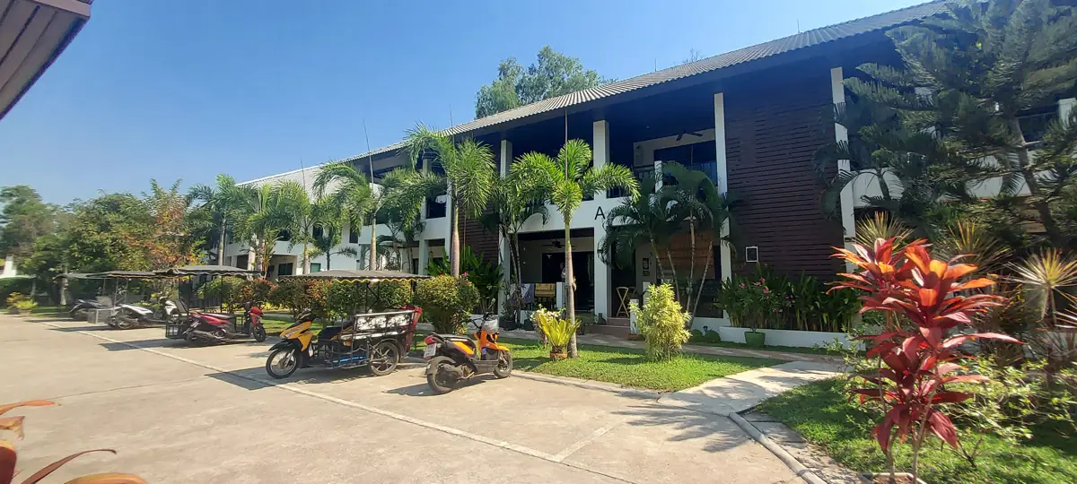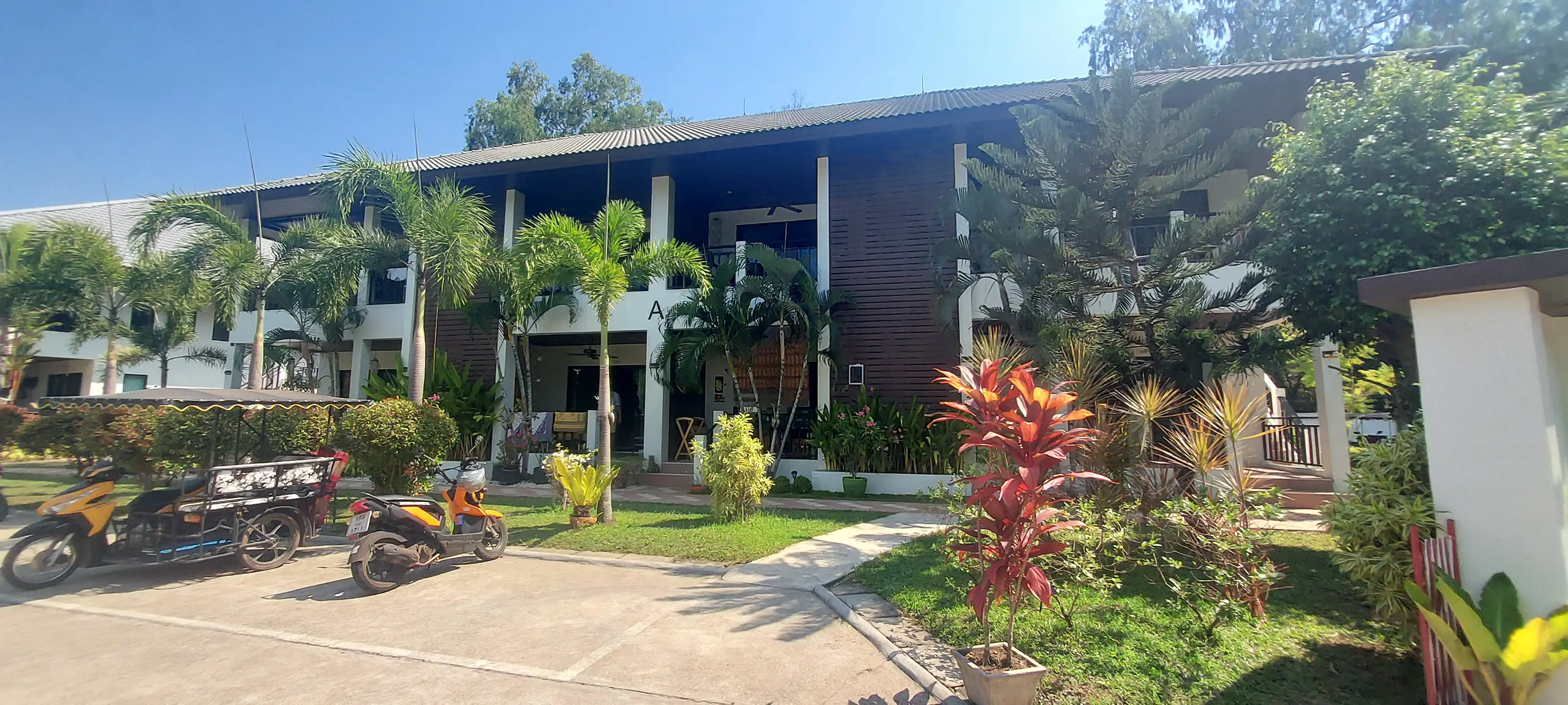 Palm Leaf Condominium consists of 3 2-storey houses with 8 condos in each. So a total of 24 condos with living areas of 47 sq m (1 bedroom) and 70 sq m (2 bedrooms). There are also 6 detached villas and in the center a large lovely pool area with jacuzzi and barbecue area. The pool is a freshwater pool, but will soon become a saltwater pool.