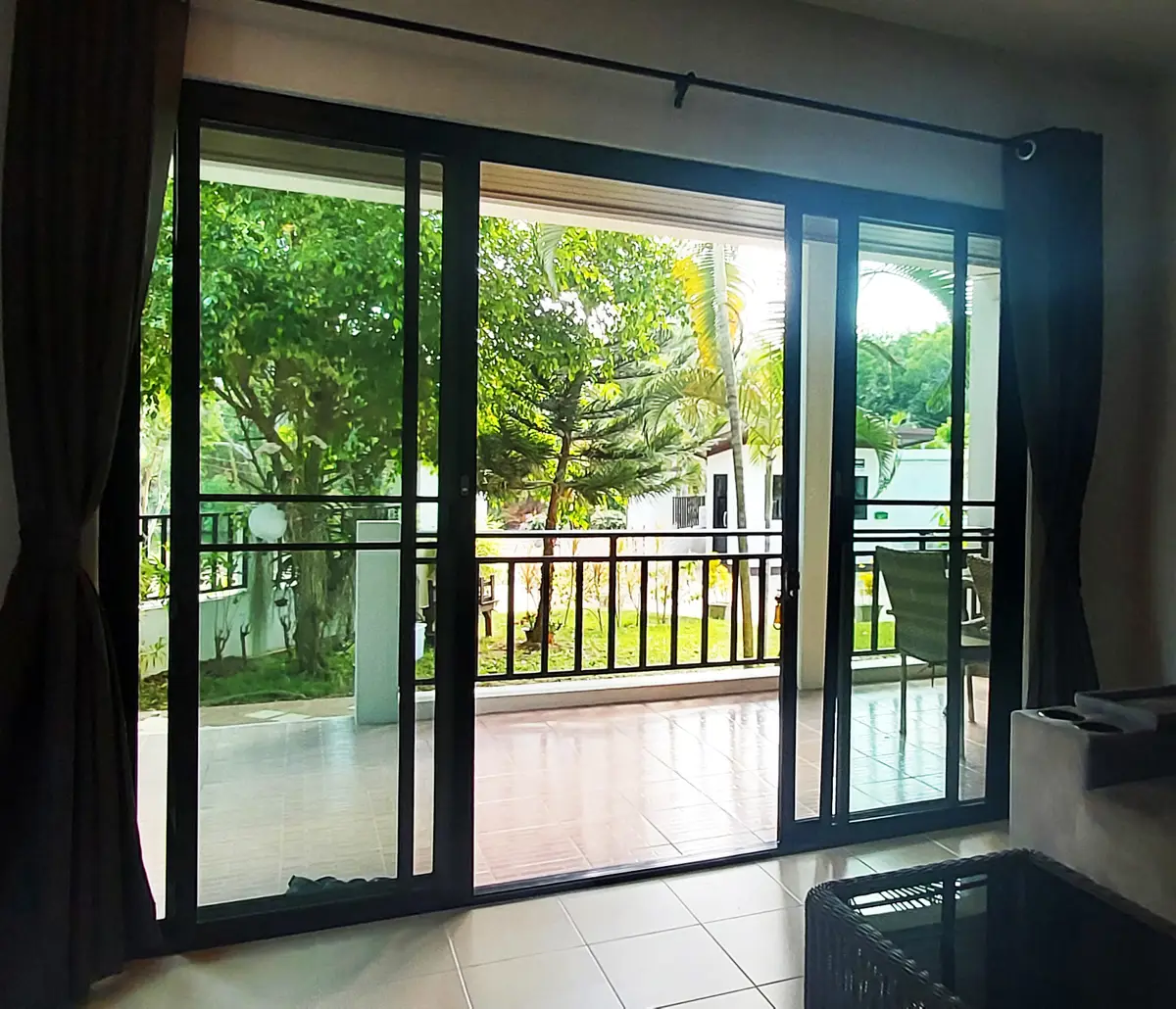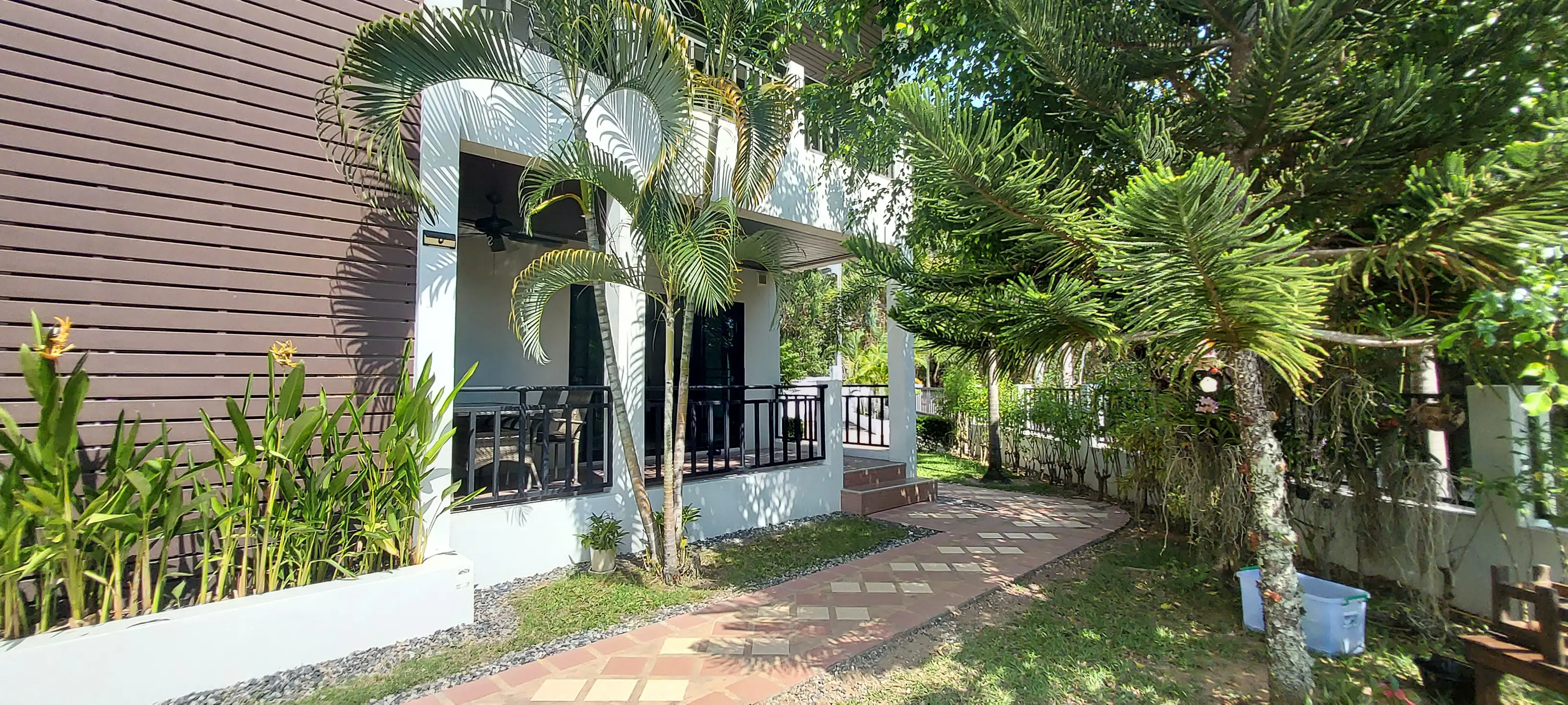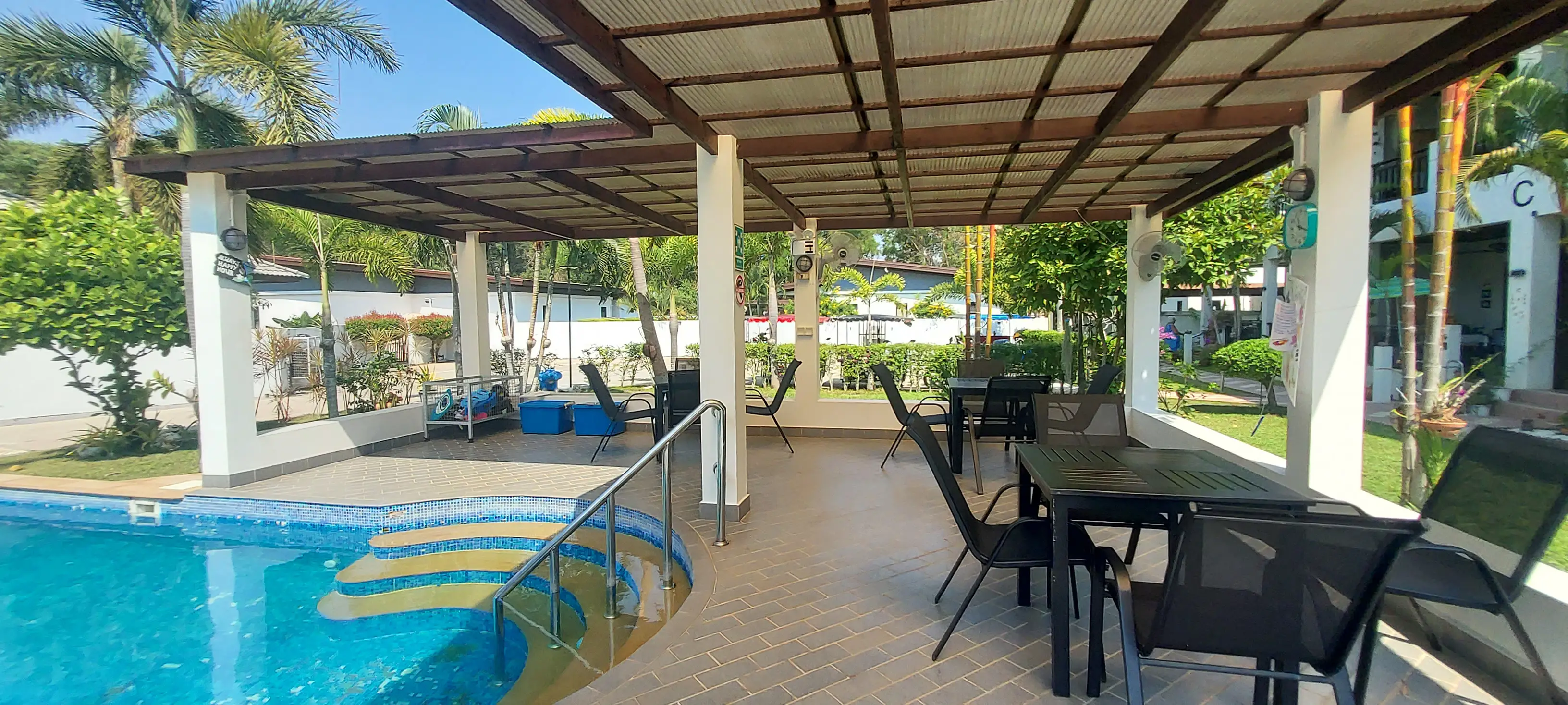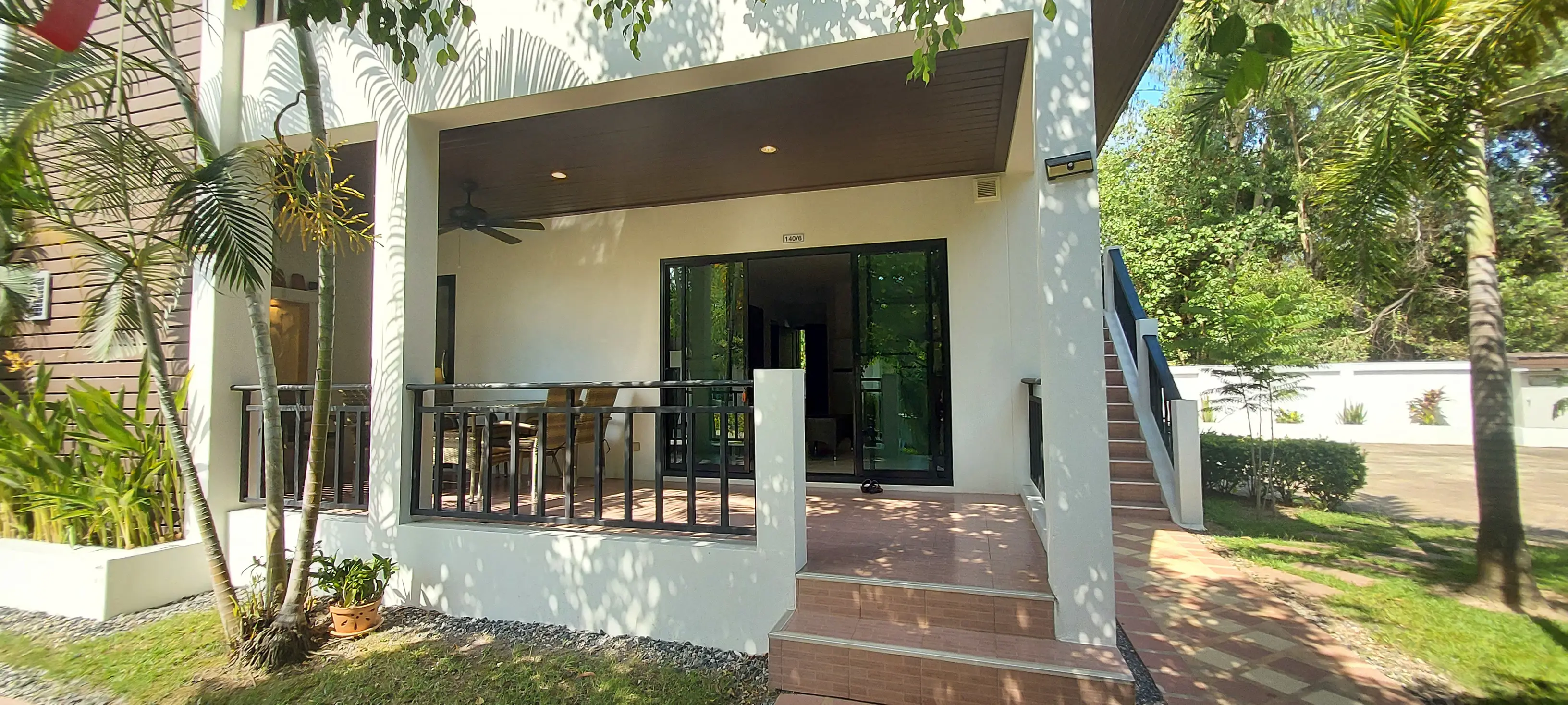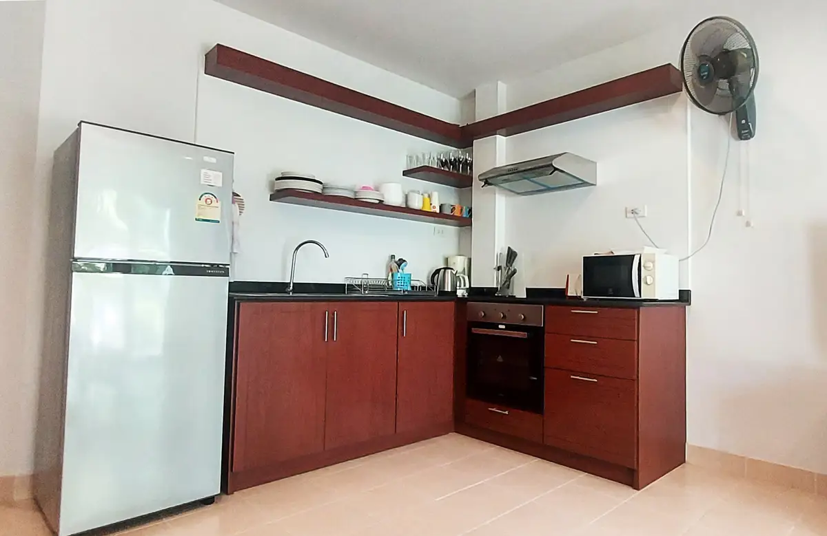 Palm Leaf Condominium consists of 3 2-storey houses with 8 condos in each. So a total of 24 condos with living areas of 47 sq m (1 bedroom) and 70 sq m (2 bedrooms). There are also 6 detached villas and in the center a large lovely pool area with jacuzzi and barbecue area. The pool is a freshwater pool, but will soon become a saltwater pool.