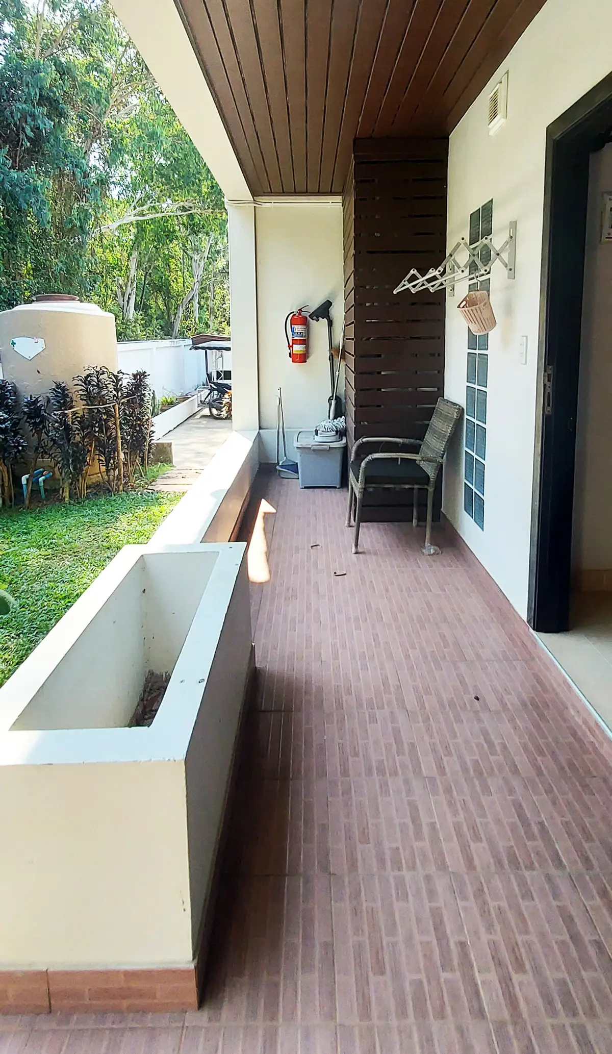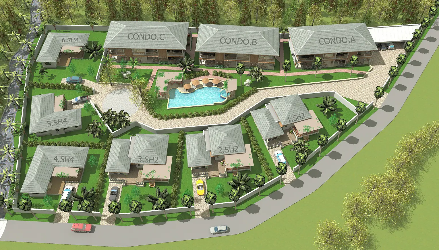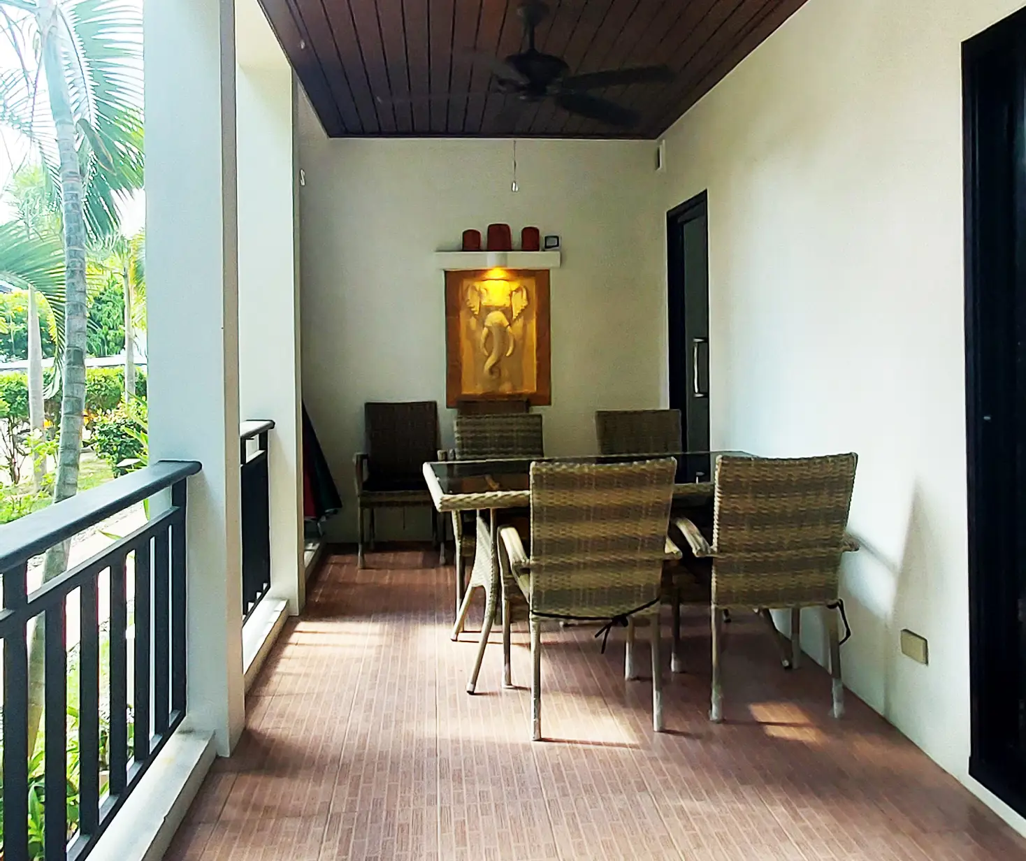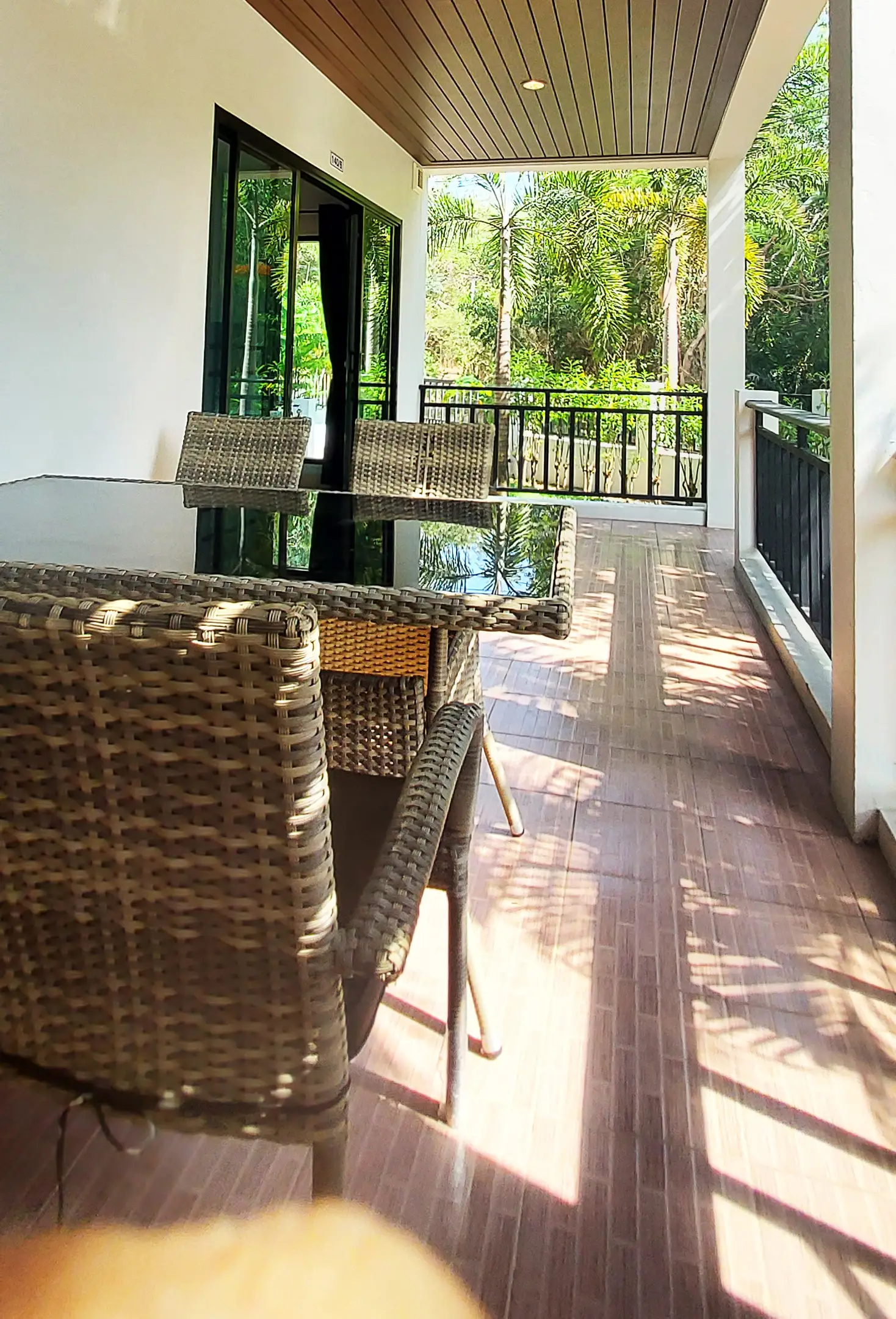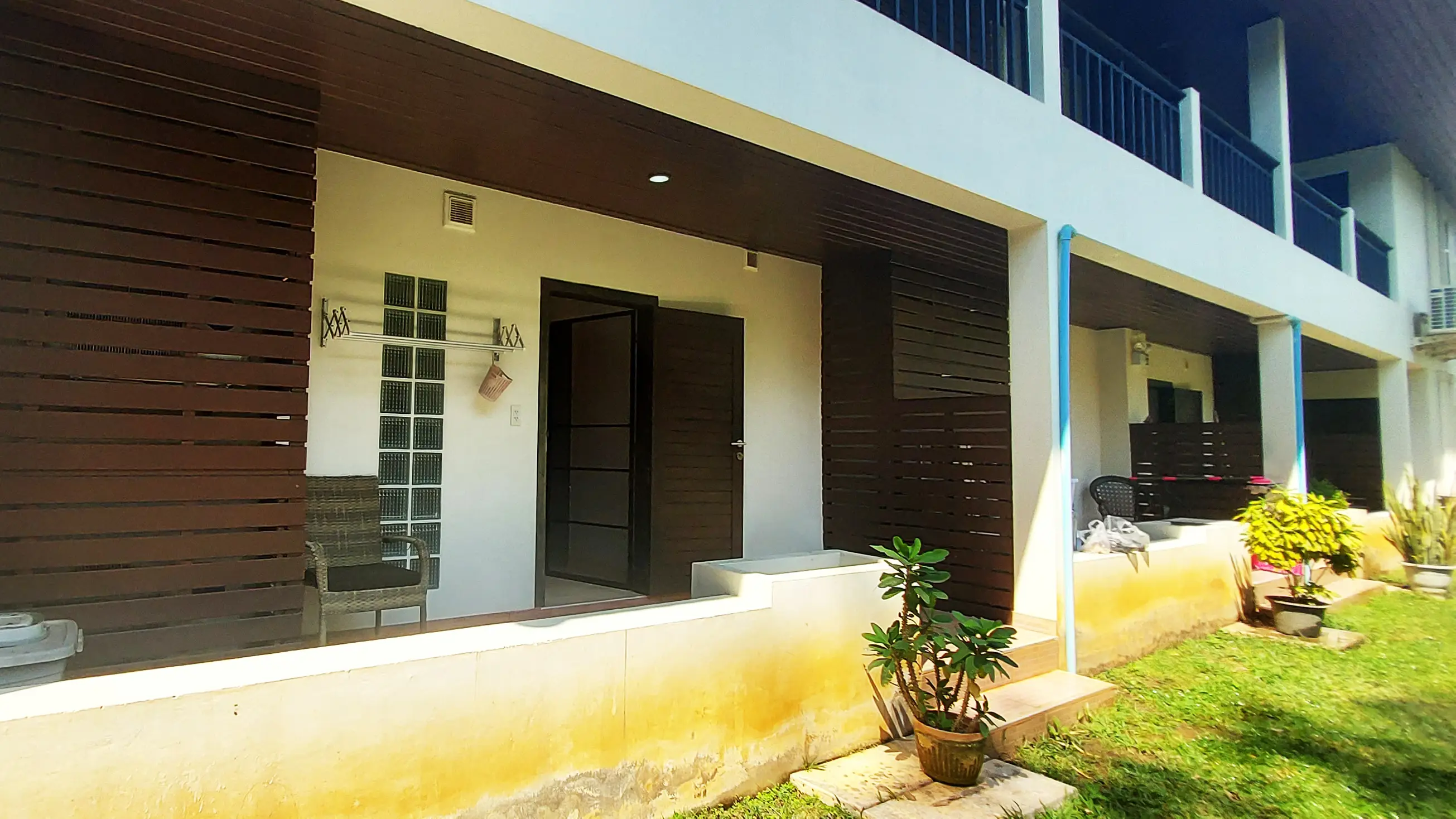 Palm Leaf Condominium consists of 3 2-storey houses with 8 condos in each. So a total of 24 condos with living areas of 47 sq m (1 bedroom) and 70 sq m (2 bedrooms). There are also 6 detached villas and in the center a large lovely pool area with jacuzzi and barbecue area. The pool is a freshwater pool, but will soon become a saltwater pool.