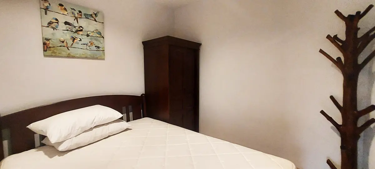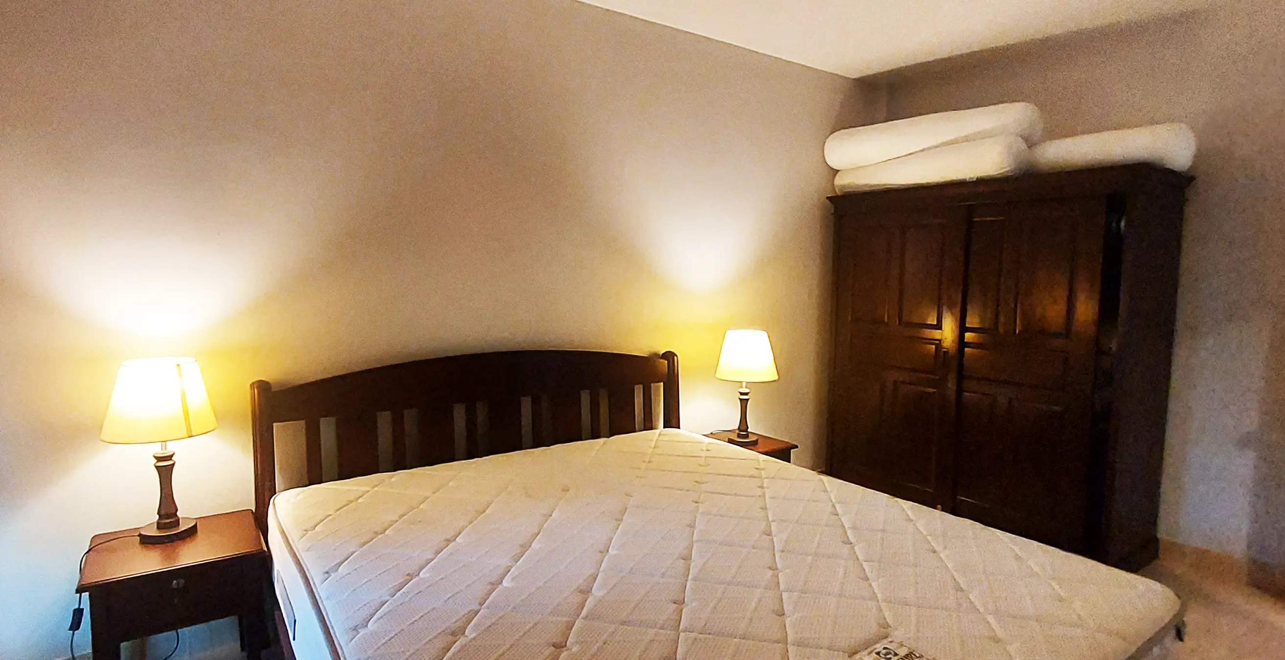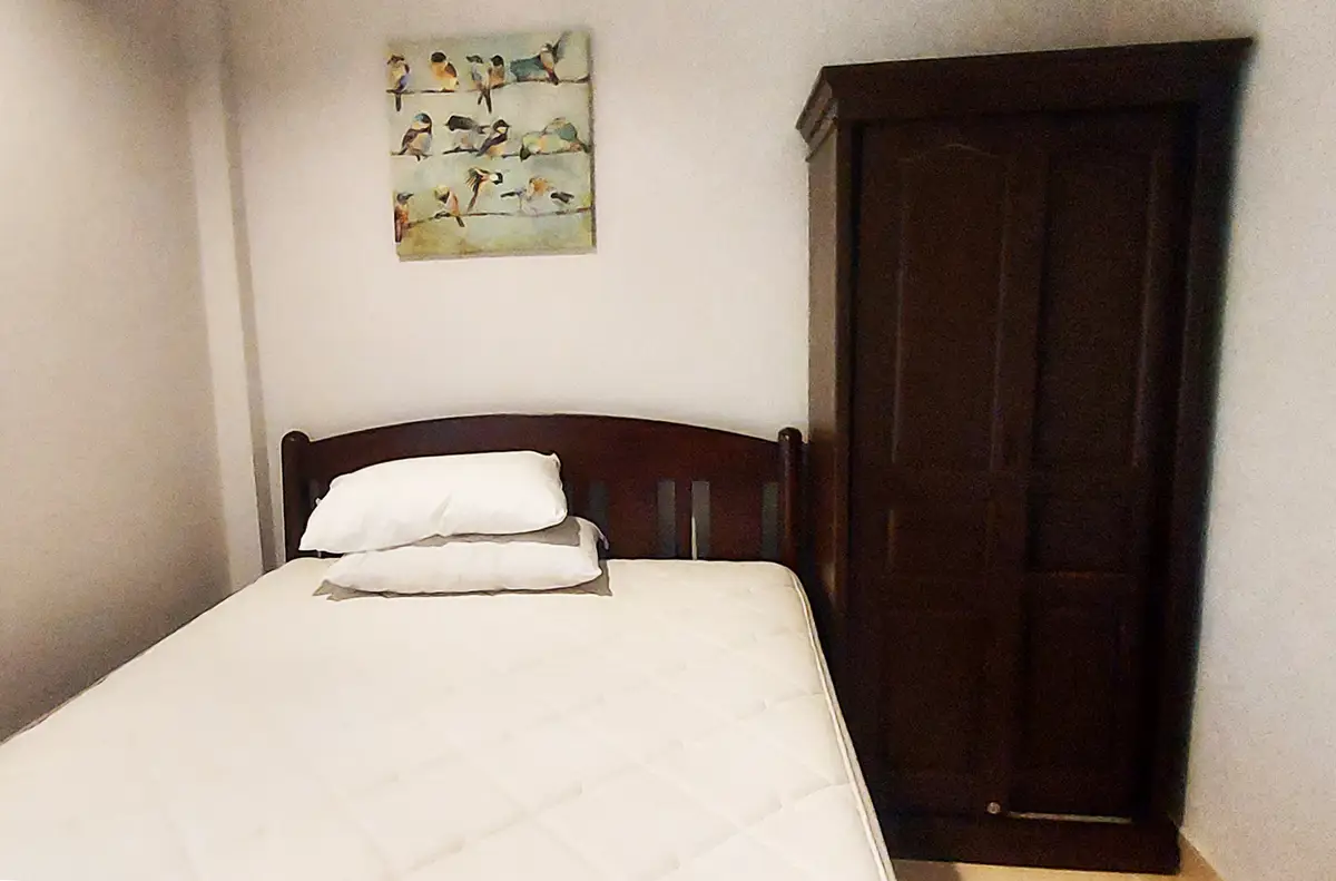 This condo is located in building A on the ground floor and at the end of the house. It has a living room and a well-equipped kitchen in an open plan, as well as 2 bedrooms and a fully tiled bathroom, with a living area of 70 sq m. There are 2 terraces. One at the front and one at the back. Both bedrooms and the living room have AC.