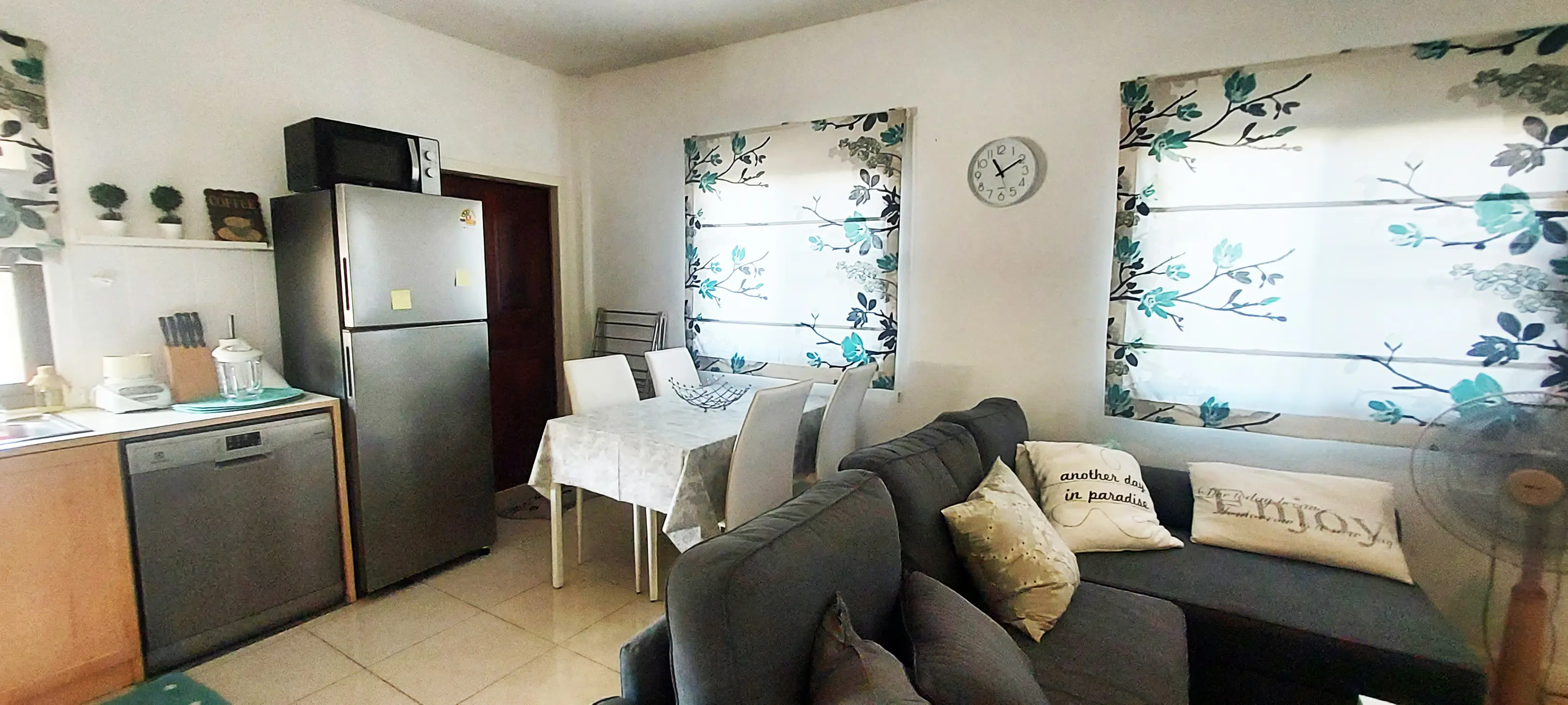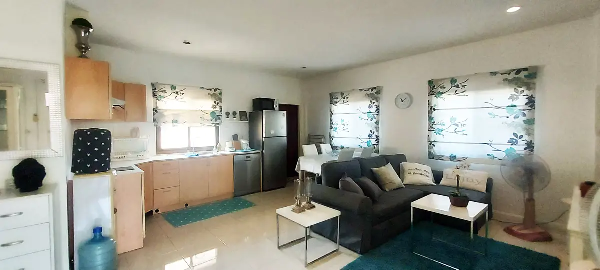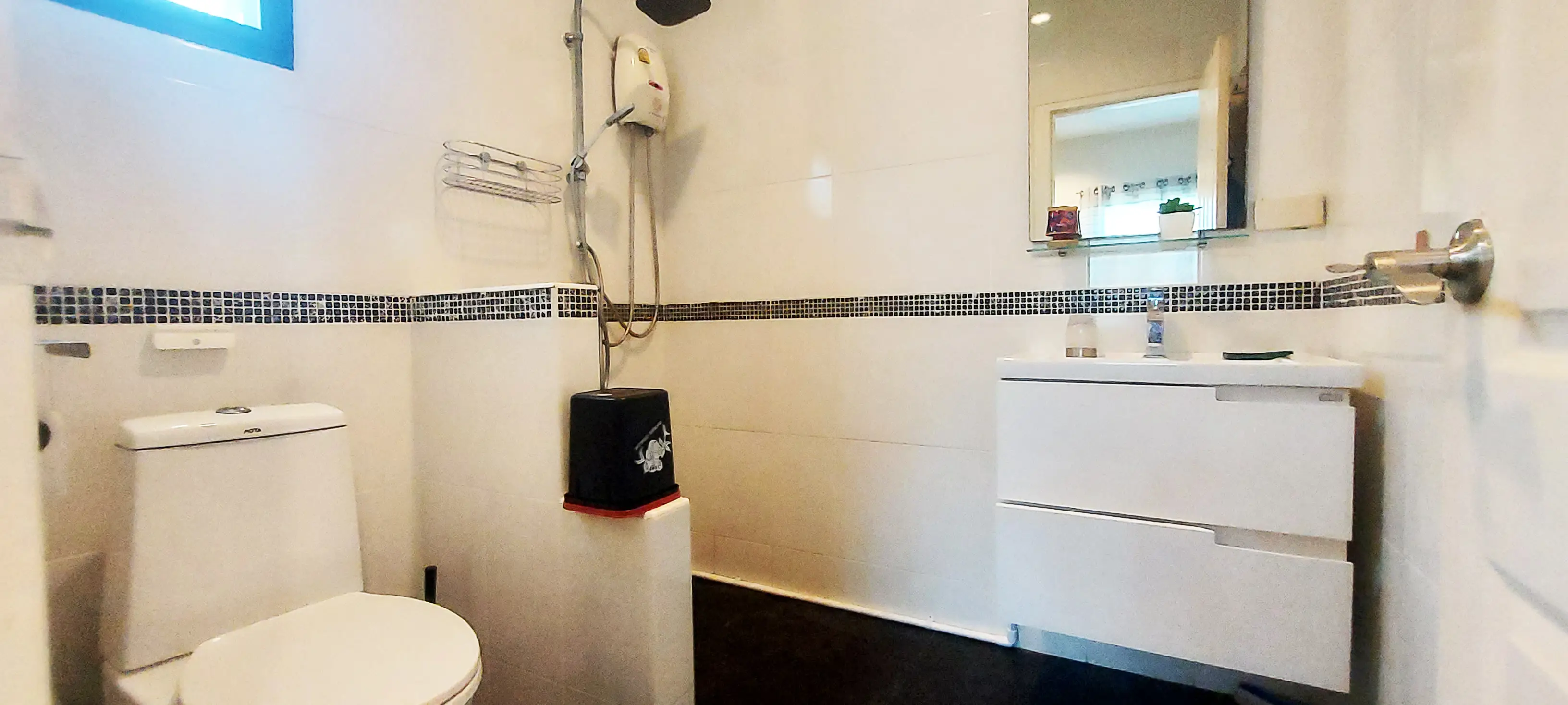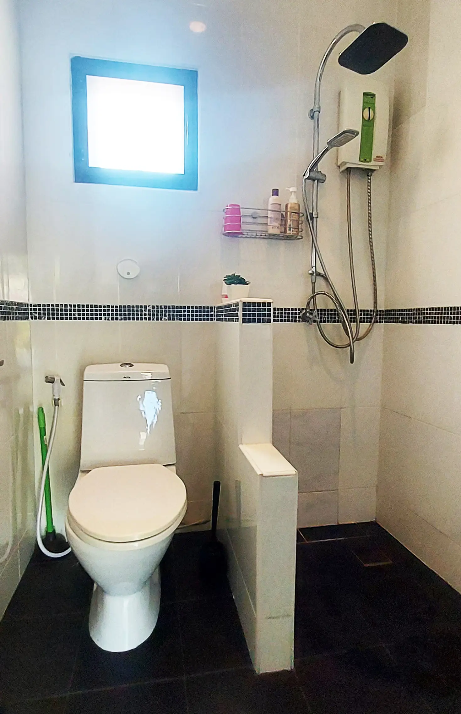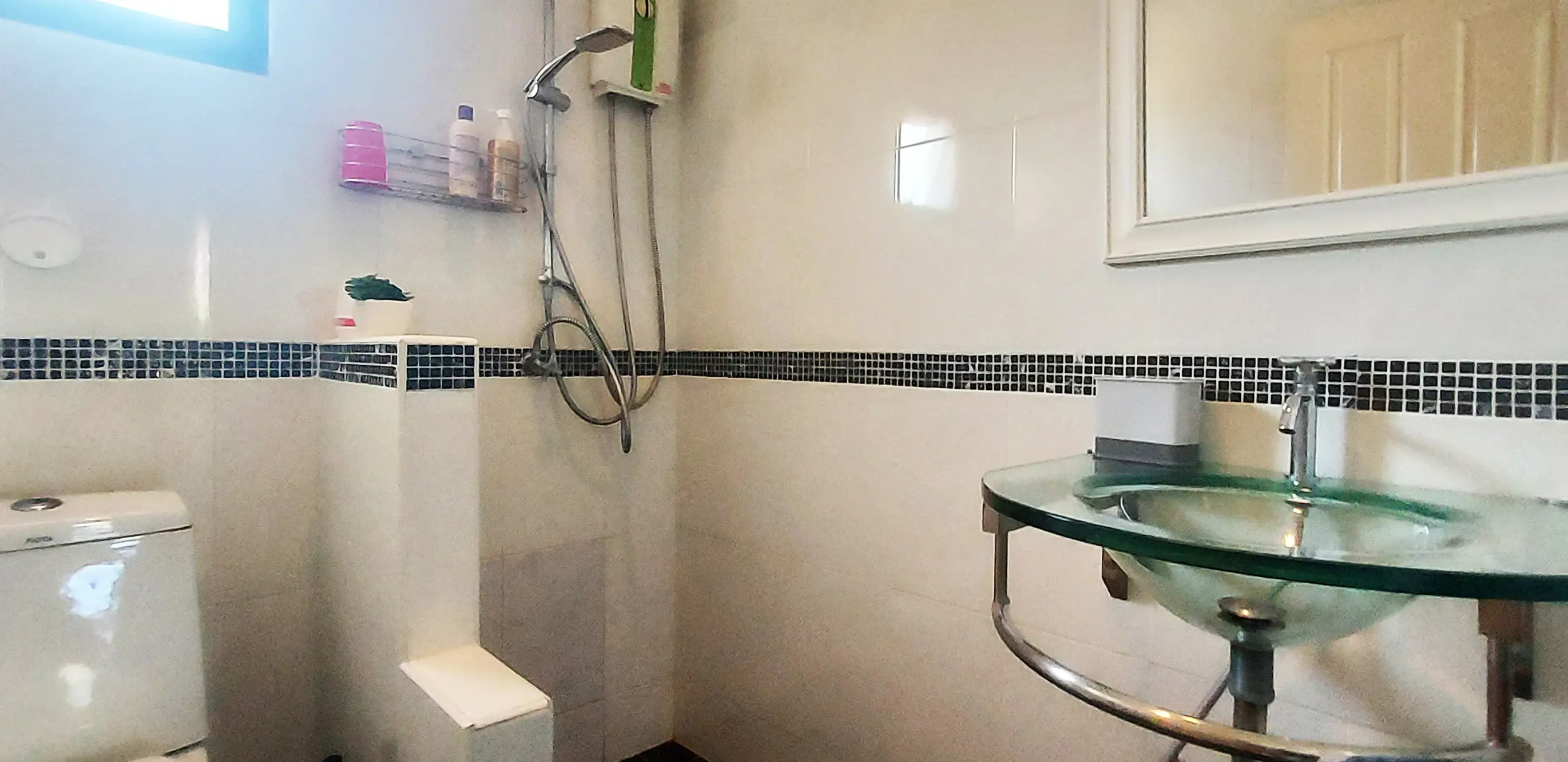 Both bathrooms are fully tiled with separate heaters for hot water in both. In connection with the outdoor kitchen there is a washing machine and an outdoor shower. All 3 rooms have AC. The living room area has a TV.