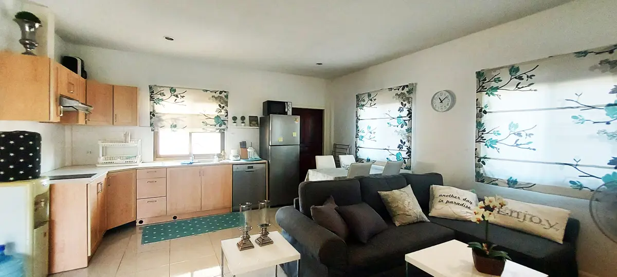 The kitchen, which is built at an angle, is equipped with stoves, dishwasher, extractor hood, fridge and freezer, microwave, drinking water cooler, and many cabinets for storage. The large terrace at the front of the villa is also equipped with a refrigerator.